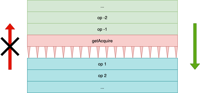 Thus, getAcquire acts like a one-way fence for all loads and stores that follow. I like to imagine it having thorns pointing